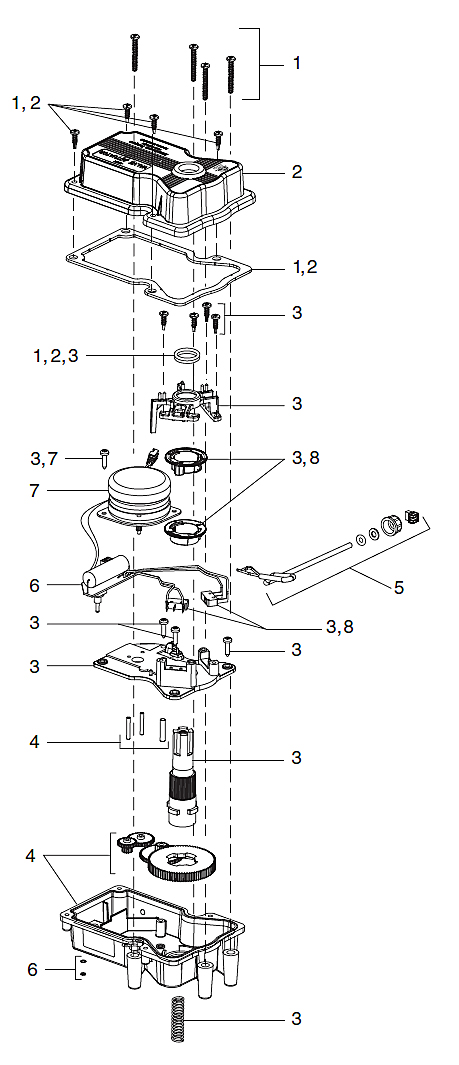 Center Plate Kit. O-Ring. Screw, #8 x 5/8". Bridge.Top Cam (Clear). Bottom Cam (Textured). Microswitch. Center Plate. Output Shaft, Threaded. Spring, JVA