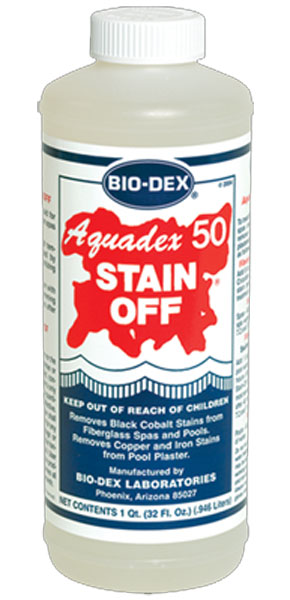 Aquadex 50 Stain-Off / Spa Stain Off removes copper iron and metallic stains from plaster pools and black colbalt stains from fiberglass. It goest to work immediately and swimming can resume 4 hours after application with continuous filtration. Stain removal results can be noticed within 48 hours up to 10 days depending on how old or fresh the stains are. The product is stable at higher temperatures so works well in the spa environment. The effectiveness of Aquadex 50 Stain Off won't be compromised by chlorine, acid or other sanitizing products. The product can be mixed with Plaster White 'n Brite as a booster for removing difficult metal stains in an acid wash.