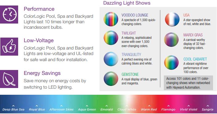 Commercial Product LogosBring color to all corners of any commercial pool or spa with ColorLogic 320 & 160 LED lights! The new 1.5-inch pool, spa and accent lights provide low-profile, total color coordination of all water environments and complete synchronization with all Universal ColorLogic lights. With 10 fixed colors and 7 color-changing shows, the ColorLogic 1.5-inch lights can light an entire pool or spa, and is also ideal for highlighting steps, bubblers, baja shelves and other water features.