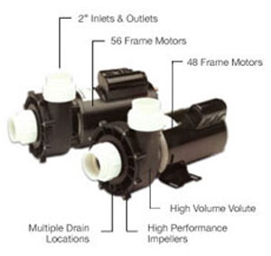 Flo-Master XP2 pumps easily outperform every other 48 frame pump on the market while utilizing the same space requirements. Having a shut-off head of more than traditional 48 frame spa pumps, but less than 56 frame pool pumps, these unique pumps have been designed for today's large, heavily jetted spas requiring increased flow.