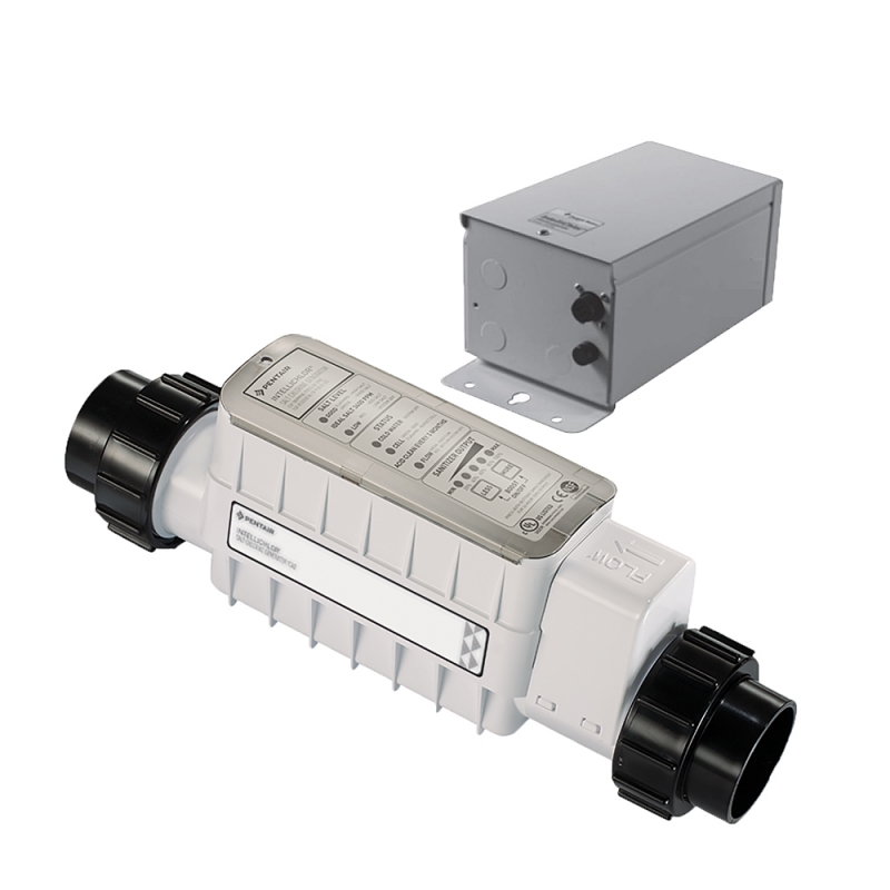 Intellichlor chlorine generator includes Power Center and IC40 cell for 40K gallons of water. Intellichlor salt chlorinator is a complete unit and ready for install. Intellichlor IC Cell blades are rated for more than 10,000 hours of operation five years of reliable chlorine output under normal operating conditions Full diagnostic capabilities, including cell life tracking that communicates remaining hours of cell life in real-time. Intellichlor chlorine generator captures all performance data daily (production settings, hours of operation, chlorine output, cell cleaning cycles, salt readings, and water temperature averages) making it easy to maintain perfect water Push-button operation and easy-to-view displays enable fast checking of salt levels, cell cleanliness, sanitizer output, and water flow Automatic shut-off feature protects the unit and prolongs cell life under low water temperature conditions Union inlet and outlet connections make cell replacement fast and easy On-time cycling prevents calcium and scale build-up to maximize cell life Ability to communicate with IntelliTouch Automation Systems Certified to UL 1081 standard for safety