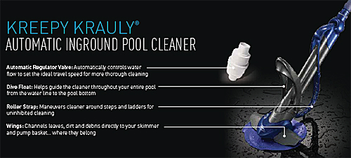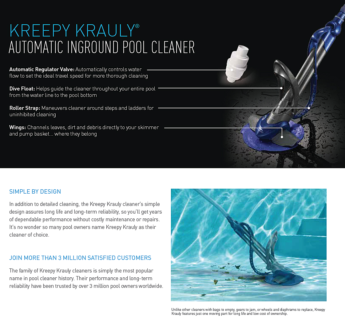 The Kreepy Krauly has been redesigned for greater cleaning coverage from the water line to the pool bottom. But it still gives you all the simplicity and reliability that over three million owners have trusted for decades. Kreepy Krauly cleaner's powerful suction relentlessly removes dirt and debris automatically. And with only one operational moving part, you can count on years and years of dependable service, and an exceedingly low cost of operation.