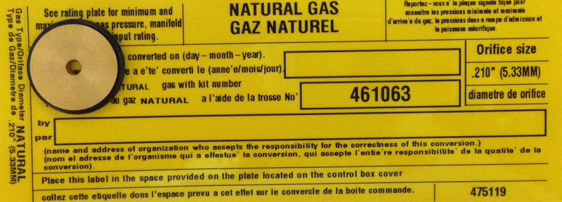 Conversion Kit Natural Gas to Propane Gas model 125K