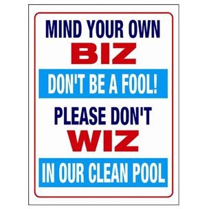 This fun pool sign is 18" x 24" and constructed of heavy duty plastic. It has pre-drilled holes for easy hanging. It also features U.V. resistant ink so it will not fade. Humorous no whizzing in our pool sign.