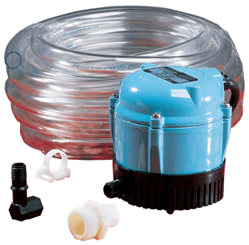 Complete kit ready for installation contains model #1 style pump with power cord, garden hose adaptor for 1/4" MNPT outlet, 25' of 1/2" I.D. tubing and fastener clamp.