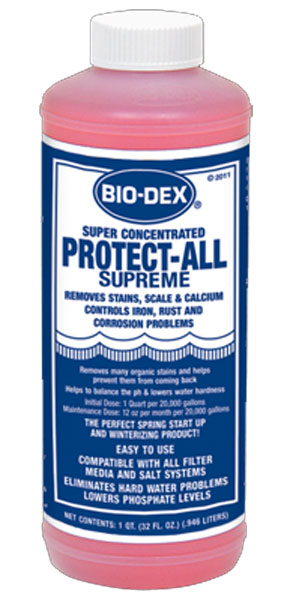 Protect All Supreme is an easy-to-use product that removes problems such as calcium and scale-buildup on pools, spas and decorative pools.