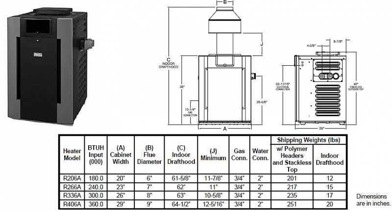 RAYPAK MODEL P-R206A-EP-X #57 CUPRO NICKEL 180K BTU Propane Gas PRODUCT CODE: 014950 RUUD NO: 015006 Cupro-Nickel Fin Tube - Specialty Raypak Digital heaters can be ordered with cupro-nickel fin tube heat exchangers for added protection against aggressive water chemistry. Although rare, there are certain applications, like health club spa’s, where copper is just not the best choice. Cupro-nickel offers superior tolerance to bad and fluctuating water chemistry, thanks to a harder surface and a thicker walled fin tube. • Microprocessor Controlled Thermostat The Raypak Digital gas heater comes with a microprocessor based thermostat control. This control allows you to set your pool or spa temperature precisely at your favorite setting just by pressing an up or down temperature control button. The Digital display gives you a constant read out of your pool water temperature. Just set it, and forget it! Truly simple. • Self Diagnostic Troubleshooting a gas heater has never been easier. The Raypak Digital has on-board diagnostic controls that let the user and the service professional know what is going on with the heater at all times. In the event that you would ever have a problem with the heater, the digital display will show where the problem is in the control circuit. It's like having a service technician built into every heater! Wind Resistant Cabinet• Polytuff Powder Coating The Raypak Digital has a polyester coated, non-corrosive cabinet that is more durable than solventborne and waterborne coated metal cabinets. Every piece of sheet metal that gets powder coated goes through a 7-stage wash system making certain the powder paint has a perfect bond. Underneath the tough and beautiful finish you will find galvanized metal that offers superior rust prevention and years of durable service. The Raypak Digital incorporates the latest in header design technology. Raypak's state-of-the-art engineering department utilized the latest in 3-D computer aided design to engineer the part for optimal performance. Polymer• All Copper Fin Tube Heat Exchanger All Raypak Digital gas heaters come standard with integral copper finned tube. This means that the fin tubing is made from one piece of extruded copper tube. Since the fins are integral to the tube, maximum heat transfer is attained. Every Raypak Digital has the same robust design tube bundle that we use in our large gas commercial boilers. • Stainless Steel Tube Sheet resin headers. This allows for a completely nonferrous waterway leaving your pool truly rust-free. • Fuel Efficient Combustion ChamberQuality • ISO 9001 Raypak is proud to be a ISO 9001 registered manufacturing plant. One more reason why Raypak is number one in the heater industry today.
