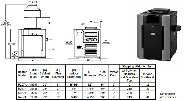 Features: Raypak's Low Emissions units use combustion control to minimize levels of nitrogen oxides (NOx). The units meet emissions standards in all Low NOx areas, from Los Angeles (SCAQMD Rule 1146.2 certified) through the San Joaquin Valley (SJAPCD Rule 4308), and any other areas applying the stringent SCAQMD standard - the "Gold Standard" of emissions regulations - to residential pool heaters. Available for natural gas only Digital Controls provide solid-state reliability and accuracy and clear diagnostics. Setting it for the temperature you want is a snap...push a few buttons and walk away. PolyTuf Textured Powder Coating The Raypak gas heater has a polyester-coated, non-corrosive cabinet that is more durable than solventborne- and waterborne-coated metal cabinets. Every piece of sheet metal goes through a 7-stage wash system, making certain the powder paint has a perfect bond. Underneath the tough, yet beautiful finish you will find galvanized metal that offers superior rust prevention and years of durable service Wind-Resistant Design No need for fans to combat drafting problems. This heater is designed to draft naturally in outdoor installations with its exclusive low-profile design. It is so thoughtfully and carefully designed it actually protects itself from the things that tend to stifle ordinary pool and spa heaters. It delivers uninterrupted heating performance regardless of falling leaves, wind, airborne debris, rain, downdrafts, updrafts, sleet, snow, etc. Polymer Headers Polymer headers prevent rust stains from harming your pool’s surface, giving you years of trouble-free swimming pleasure. All-Copper-Fin-Tube Heat Exchanger The fin tubes of the heat exchanger are each made from a single piece of extruded copper. This integral-fin design allows maximum heat transfer to be attained and maintained. These headers are specifically designed for the residential market...for commercial installations, use the ASME models. Stainless Steel Tube Sheet Stainless steel tube sheets are used on all Raypak gas heaters. This allows for a completely nonferrous waterway, leaving your pool truly rust-free. CPVC 2" Water Connections Standard with every Raypak is a set of 2" slip-fit CPVC water connections to make your installation secure and effortless. Condensation Protection The Unitherm Governor inside the header helps reduce condensation from low inlet water temperatures. It automatically regulates the water flow to help keep the water temperature in the heat exchanger above 105°F. Both water temperature and water flow rate are controlled to eliminate condensation, sooting, and scale build-up that can shorten heater life. High Flow Rates The Raypak gas heater comes with an automatic bypass built into the header. You'll find that the heater is capable of handling water flow at a rate up to 125 GPM. Burner Tray Every burner tray is built to last, from the stainless steel burners to the aluminized metal used in the heat sensitive areas. Innovative design allows for the easy removal of the tray and burners for servicing. Fire Tile A ceramic fiber combustion box keeps your heater running efficiently while keeping the outside jacket cool. By using this space-age material the heater won't retain residual heat after it is turned off, allowing it to be installed without the use of costly metal heat sinks. Fuel-Efficient Energy-smart Raypak heaters consistently achieve the highest efficiency ratings. They exceed all federal and state standards. BASIC DATA