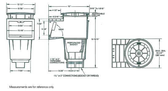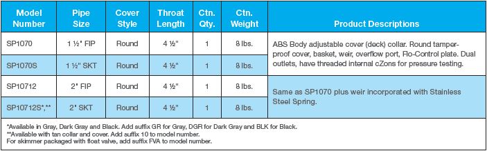 Skim Master is a non-corrosive, large capacity automatic surface skimmerfeaturing a round, tamper-proof access cover, self-adjusting 8" weir with stainlesssteel spring for added strength, dual outlets, and threaded internal connections for pressure testing. The optional float/bypass valve provides a main drain-thru-skimmer system and an automatic safety bypass for low water conditions. No glue is used in manufacturing, promoting maximum strength and longevity. SP1070 Series provide a knockout overflow port that guards against overflow or pool water refill. All Skim-Master Series Skimmers are available with Float Valve and Equalizer Kit to meet specific NSF commercial requirements.