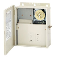 The T10000R Series Control Centers feature an all-weather enclosure and contain one or two heavy duty timer mechanisms. In addition, they have provision to install switches or GFCI receptacle on the side and additional switches inside. The enclosure accepts any combinations of P1353ME or P4243ME or T100M or RC2000M or PF1000M Series mechanisms.