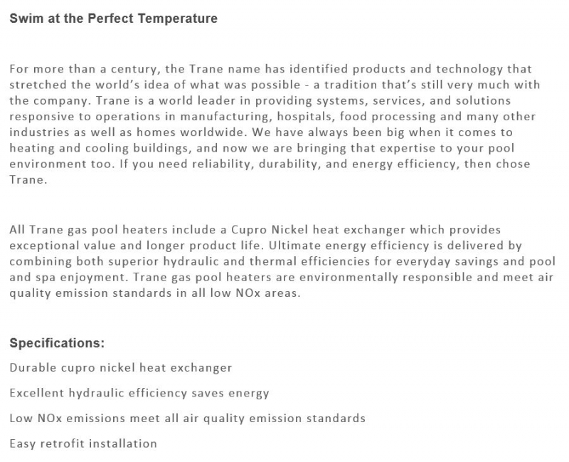 Trane Low Nox Swimming Pool and Spa Heater 250K BTU with Cupro Nickel Manual