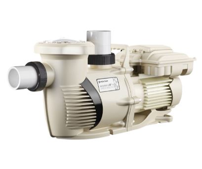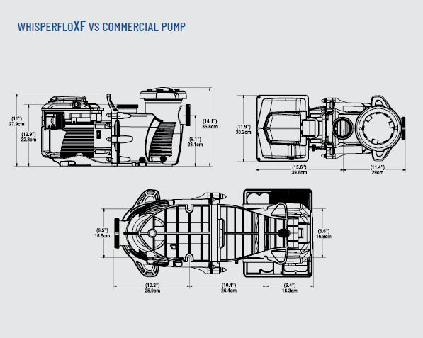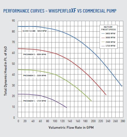 The WhisperFloXF VS Commercial Pump is the first five-horsepower variable-speed pool pump that runs on single-hase or three-phase power. It’s an economical, combined motor/drive solution for both HMAC (hotel, motel, apartment, condominium) or large residential installations. The WhisperFloXF VS Commercial Pump provides ophisticated, energy saving pump technology without the high costs typically associated with independent ump/external drive setups. STANDARD FEATURES • Integrated 5HP motor/drive; no expensive external drive required. • Versatile power input capability; runs off a wide range of single- or three-phase power. • Speed or flow control for maximum efficiency and pool performance*. • External control capability through automation systems or relays. • Intuitive programming and operation. • Meets commercial codes and agency requirements. Pump Body Volute type back pull out design for ease of working on impeller, diffuser and seal. • Port Size - Inlet (suction): 2.5" union can be adapted to 3 inches. - Outlet (discharge): 2.5" union can be adapted to 3 inches. • Material - 30% glass filled polypropylene materials. - 1⁄4" NPT thermoplastic drain plug of thumbscrew (no tool required) design on the strainer for winterizing. • Impeller - Noryl glass filled PPO resin enclosed design for corrosion prevention and maximum flow efficiency. - Threaded brass with stainless steel locking screws. • Diffuser - Glass filled noryl thermoplastic material with bronze impeller wear ring. - Hydraulic isolator design for maximum efficiency. • Seal plate - Fiberglass reinforced modified PPE thermoplastic material. • Mechanical Seal - Ceramic and carbon seal. - Stainless steel and EPDM materials • Base - Fiberglass reinforced modified PPE thermoplastic with slotted holes for easy mounting. • Gaskets - Buna N rubber compression resistant. • Bolts, Nuts, and Washers - Stainless steel and brass with nickel plating. • Corrosion Prevention - All thermoplastic pump body for maximum hydraulic performance, noise reduction and corrosion prevention. Hair and Lint Strainer • Basket - HDPE (polyethylene) basket colored white for easy debris removal. - Securely positioned below the suction inlet of the trap, with access for inspection and cleaning through the removable lid. • Lid - Clear polycarbonate thermoplastic lid for easy view into the basket area. • Lid Locking Ring - Cam and Ramp™ Lid and Locking Ring allow for quick and easy access to the basket. - O-ring seal Motor • Frame and Type - NEMA Rated 56 Frame totally enclosed fan-cooled construction. - Variable speed induction motor. • Shaft - 300 series stainless steel construction. • Thermal Overload Protection - Thermal overload protection provided by the integral motor control. • Sealed Bearings - Lubricated, double sealed, stainless steel, single row ball bearings. Electrical - 208-230/277-460V single-phase. - 208-460V three-phase. - 50/60Hz. - WEF 5.0 THP 5.0. - Single part number to cover all voltage ranges. Pump Maximum Thermal Limits - Ambient air temperature: 122˚ F (50˚ C). - Liquid temperature: 104˚ F (40˚ C).